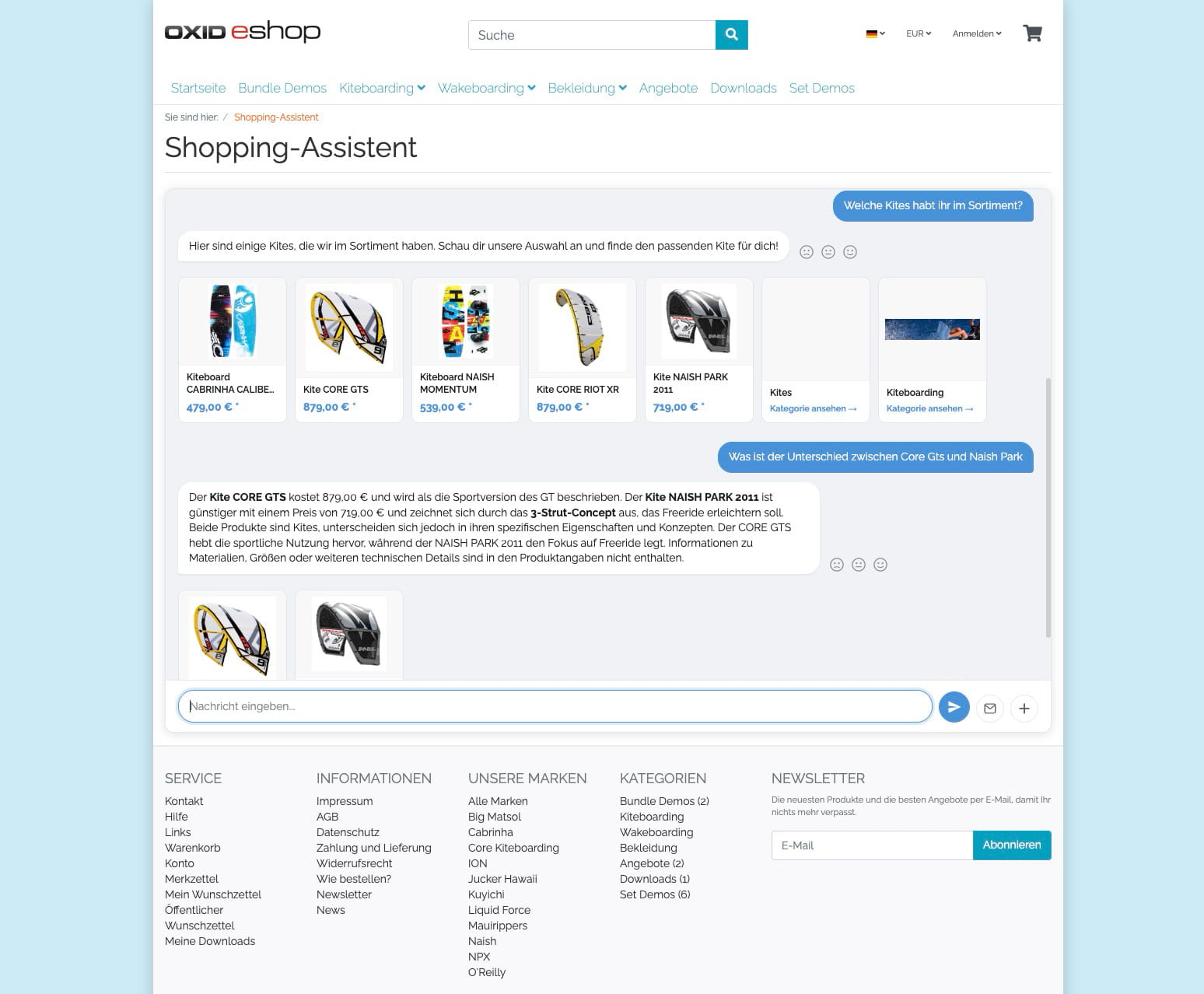 - Infoseiten-Verweise – Der Assistent erkennt Fragen zu Versand, Zahlung oder Rückgabe und verweist automatisch auf die passende Shop-Seite.